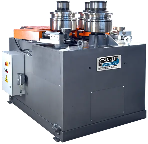CARELL's 308HV double initial pinch universal roll bending machines are available with 6 way multi-axis adjustable lateral guides, variable speed powered rotation of all three bending rolls and independent hydraulic adjustment of the lower rolls for double pre-bending. This versatile unit is ideal for rolling standard/special sections plus tube & pipe in a variety of material types. The 308HV Series Universal Roll Set is designed for bending standard profiles, flat bar (on flat and on edge), square bar, tees, channel as well as round bar, square & rectangular tube sections, angles leg-in, leg-out and can be setup to operate in horizontal or vertical position adding further value to your production.