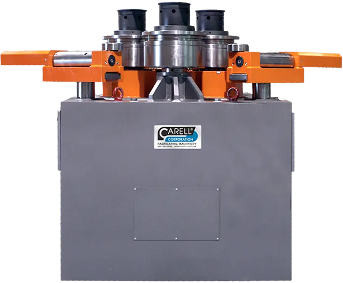 CARELL's 310HV4 double initial pinch universal roll bending machines are available with 6 way multi-axis adjustable lateral guides, variable speed powered rotation of all three bending rolls and independent hydraulic adjustment of the lower rolls for double pre-bending. This versatile unit is ideal for rolling standard/special sections plus tube & pipe in a variety of material types. The 310HV4 Series Universal Roll Set is designed for bending standard profiles, flat bar (on flat and on edge), square bar, tees, channel as well as round bar, square & rectangular tube sections, angles leg-in, leg-out and can be setup to operate in horizontal or vertical position adding further value to your production.