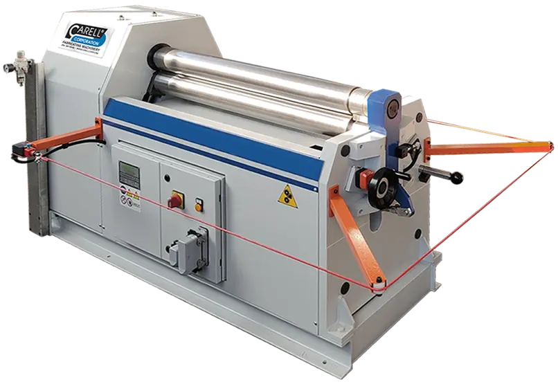 is a 3 roll, single initial pinch plate bending machine with precision adjustment of lateral bending roll and powered rotation of upper and lower pinch rolls using high efficiency motor/reduction unit. They are designed to work with 16 GA x 48” wide material in capacity.