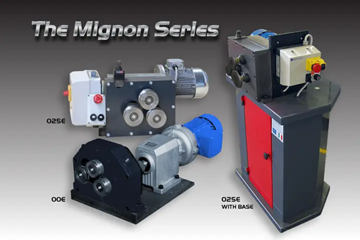The MIGNON Series Initial Pinch Roll Benders are designed for small profiles and tubes. Both units are bench mount types and are available in electric drive and manual crank drives. Mignon machines are single initial pinch types with 3 DRIVEN ROLLS for optimal traction when rolling tight diameters. Frames are steel alloy with bolted construction. High strength shafts are hardened and ground. Bending roll shaft adjustment is manual. Version 025 includes an mechanical counter to monitor bending roll shaft position.