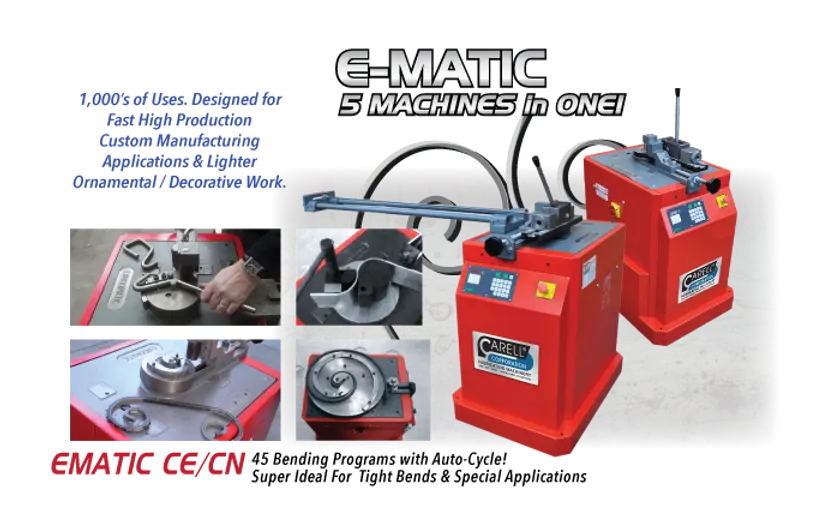 The Carell E-MATIC by Memoli; incorporates a rotary bending head, a wide stable base and digital programmable controls into a uniquely versatile package. Heavy Duty, Rugged unit is compact and easy to use. Tooling changes are rapid and simple. Application of the different attachments are shown below or use of easily produced special tooling offers unlimited versatility